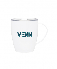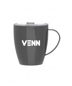 12 oz double wall 18/8 stainless steel thermal mug with copper vacuum insulation, clear acrylic push-on lid, and matching swivel; Hand wash recommended; Do not microwave; 4-7/16" h x 4"w (4-7/8 with handle) ; 355mL.
