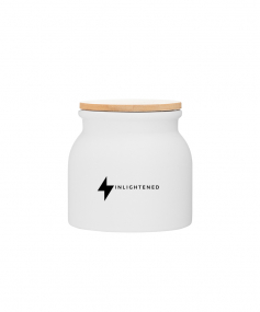 16.9 oz stoneware: matte white out / glossy white in with push-on bamboo lid; Hand wash recommended; Microwave safe with non-metallic imprint; 4 3/16 h x 4 3/16 (w/handle) w ; 500mL.