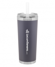 24 oz double wall 18/8 stainless steel thermal tumbler with copper vacuum insulation, stainless steel rim and base, threaded Eastman Tritan lid, snap closure, straw opening, and flexible wide silicone straw.
